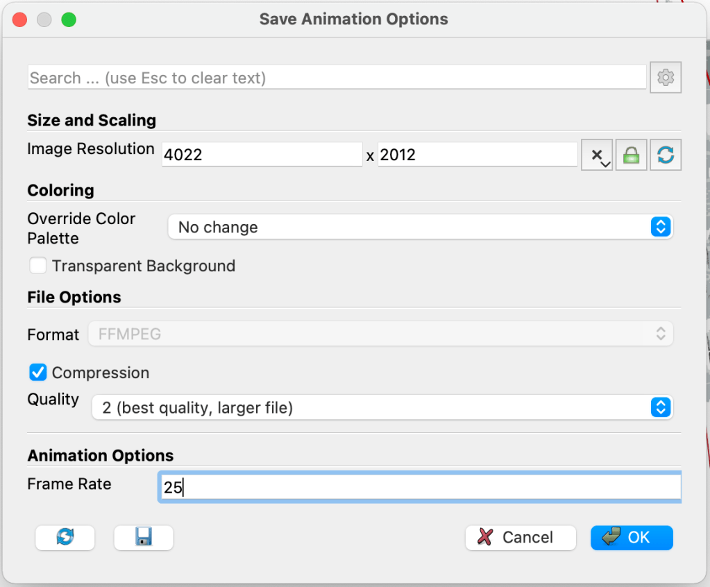 Run the animation to see that it has worked, then save the animation as .avi using: file -> save animation. For the animation options, I have 100 frames so setting a frame rate of 25 will produce a video that is 4 seconds long.